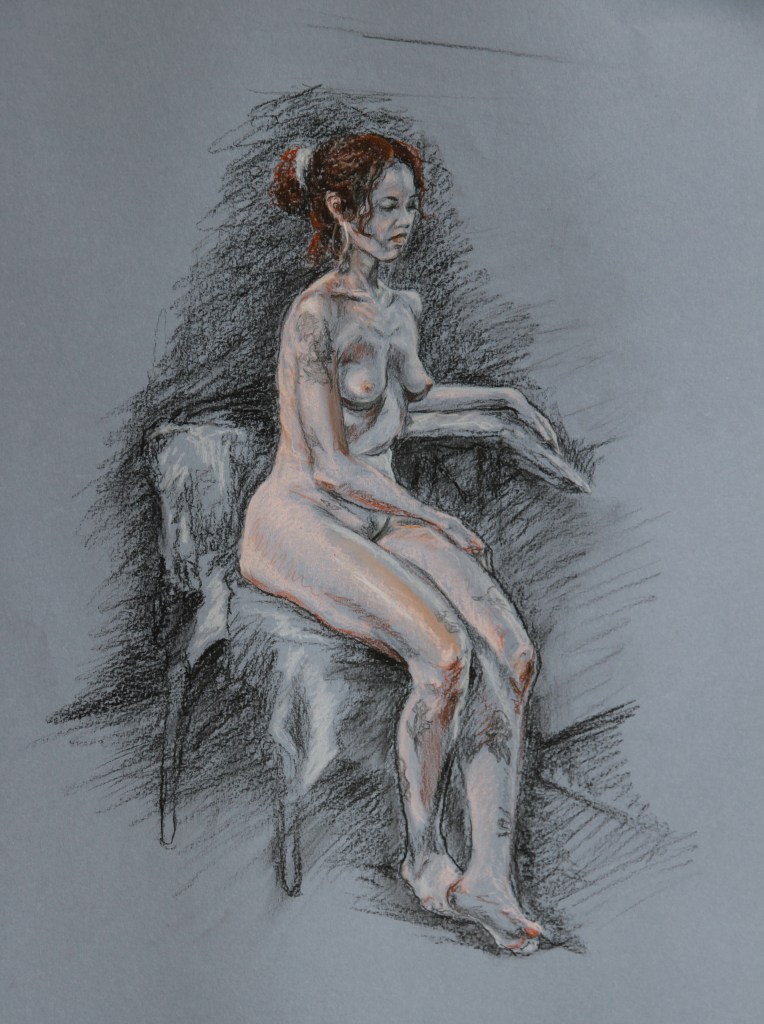 I started by mapping out the whole figure in vine charcoal, knowing I could swipe it off the smooth side of the Canson paper I was using – gunmetal grey, with the intention of using that cooler midtone to play with the shadows.