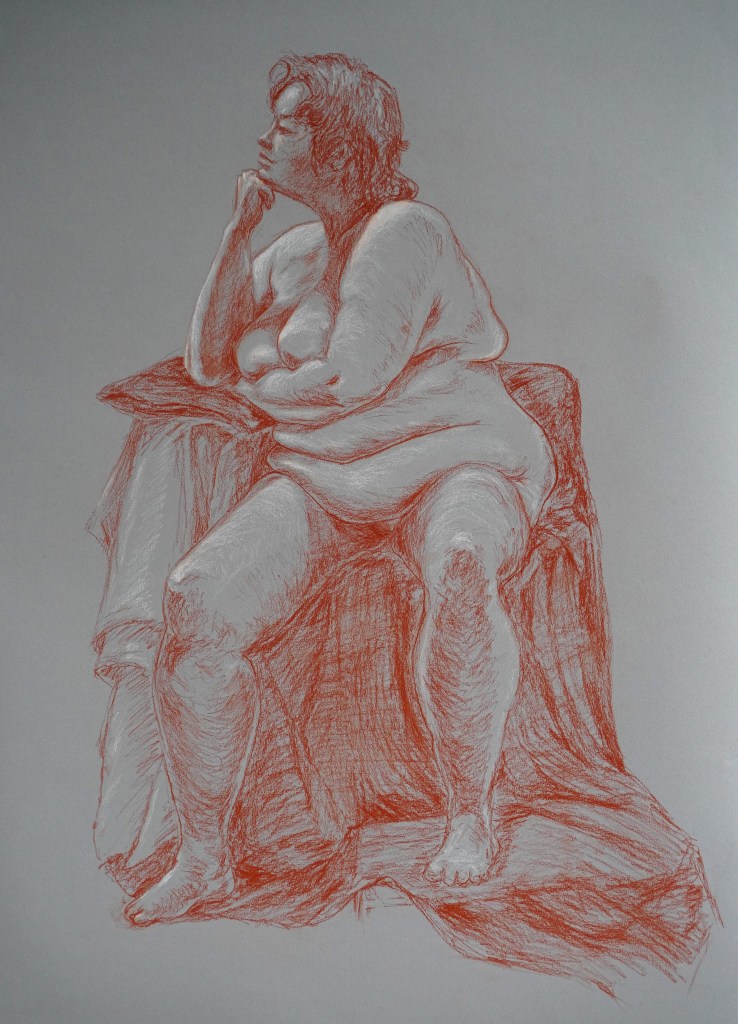 In these long pose sessions, I should be able to actually express the kind of drawing I want to make – whatever that actually looks like. To be gifted so much time and space and concentration means I should be able to finish a drawing. Yet, as much as I enjoy these sessions, all too often I have found the additional time a challenge – as in, that I feel like I have to challenge myself to prove some point that I can actually draw. Expression is not a competition, but when I see people around me managing to complete beautiful oil paintings in an afternoon while I struggle my way around basic issues with anatomy with charcoal or pencils, I feel like I am letting the opportunity get away from me.