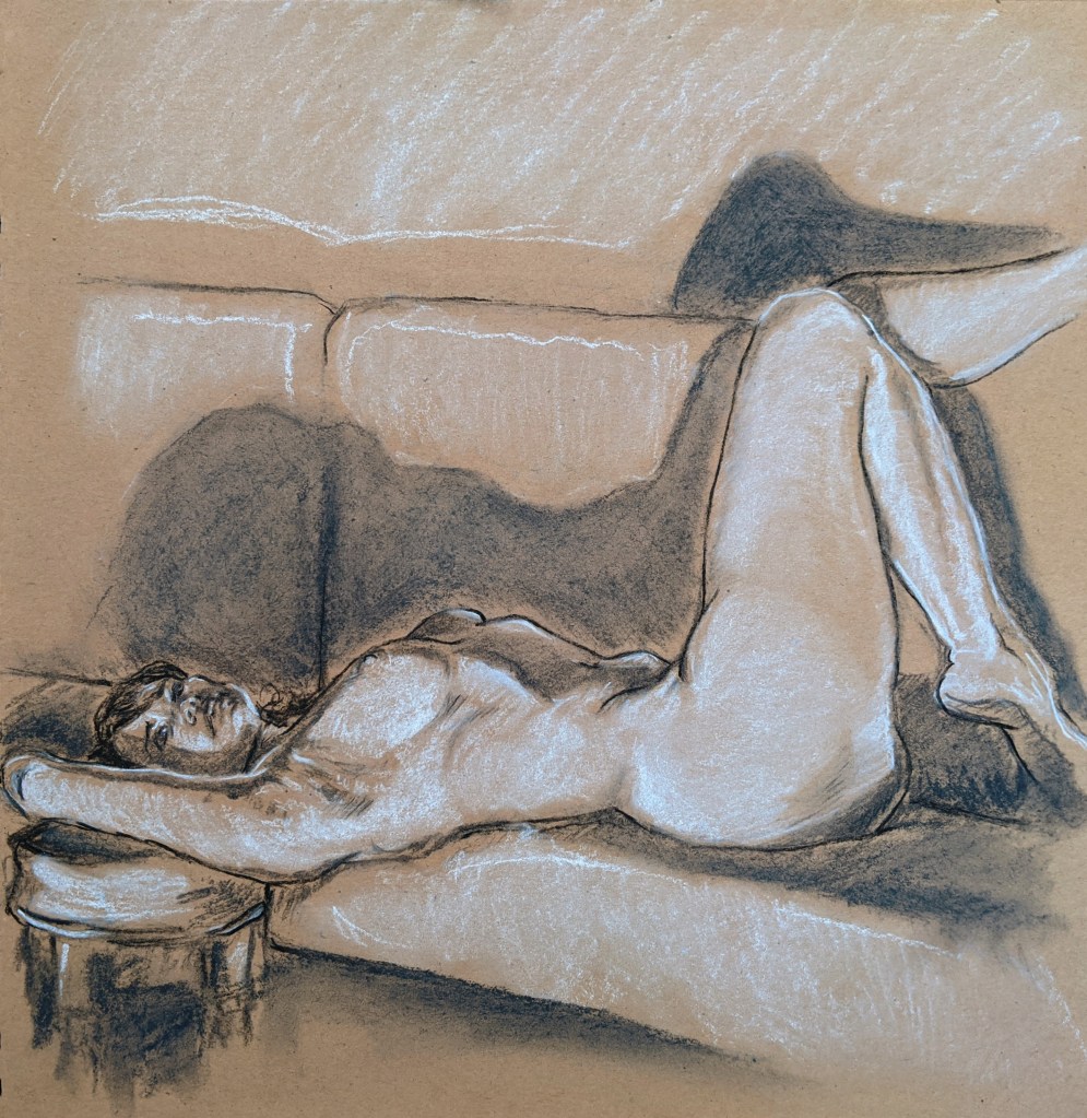 A vine charcoal on newsprint sketch of life model Purdey, chanelling some Henry Fuseli spirit, at Dulwich Art Group’s Halloween life drawing special on 30th October.
