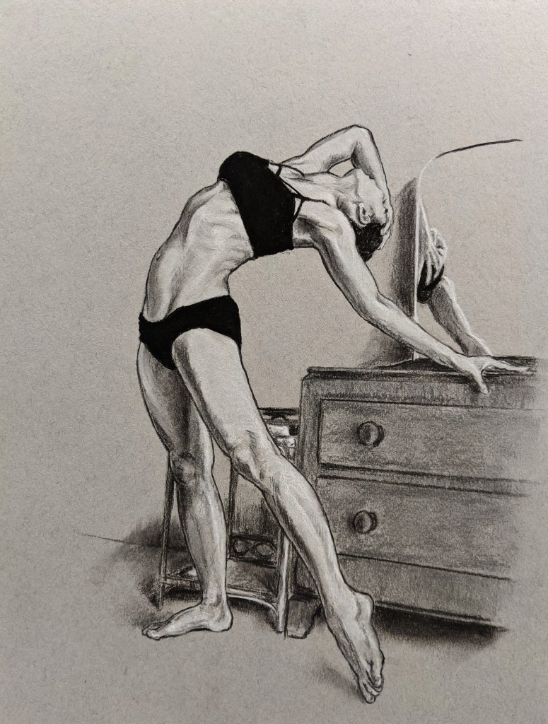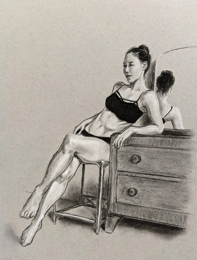 Natsumi is a tremendously athletic model, able to hold almost impossibly graceful poses for great lengths of time. I’ve often struggled a little when sketching Natsumi in person because I tend to get intimidated by these wonderfully balletic angles that I’m not sure my clumsy hands can interpret properly. Even here, with the benefit of being able to draw from reference videos at my own pace, I don’t think I was light enough to entirely do these justice, but I was inspired by the coiled energy followed by the energetic release, the tension held within the limbs even when seated.