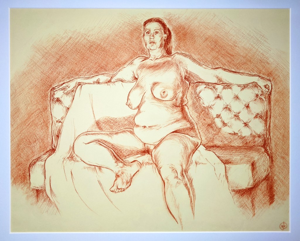 Sol is always so generous in these sessions, and even in longer poses will seek to offer something to latch on to and create interesting shapes. This was probably around 30 minutes, using a Derwent dark sanguine pastel pencil on an unusual piece of very thick dappled card I found somewhere. The surface was remarkably smooth but had a very nice off-white staining across it.