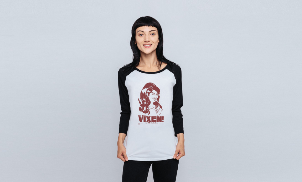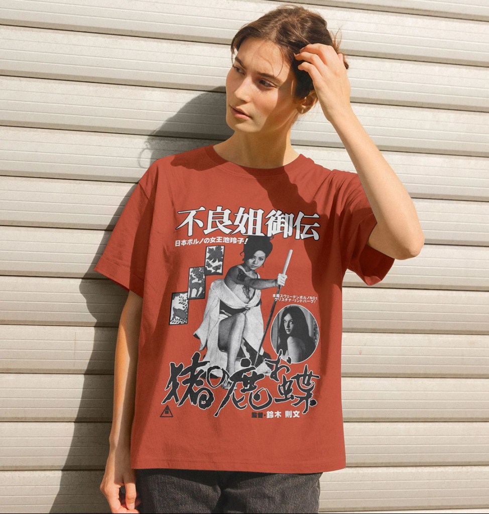 At Teemill, you’ll find a whole range of shirts, jumpers, poster prints and tote bags. There are collections inspired by 2 Russ Meyer classics: FASTER, PUSSYCAT! KILL! KILL! and VIXEN!, a full range of shirts based on all four Meiko Kaji Female Prisoner Scorpion movies, Reiko Ike’s incendiary turn in the Pinky Violence classic Sex and Fury, Francis Ford Coppola’s Rumble Fish, and a whole lot more, including Batman Returns and Jaws.