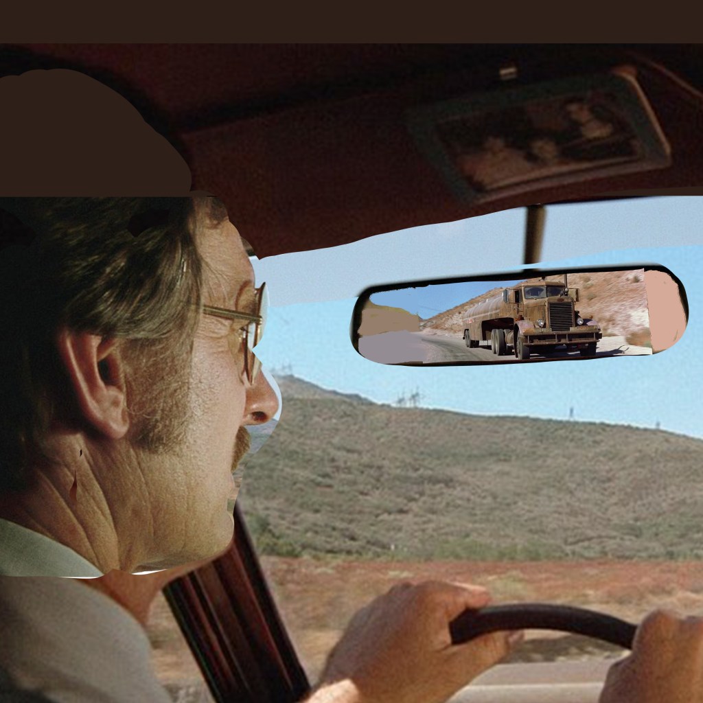 This one started life as an incredibly janky composite of screenshots in Photoshop, just to see how best to organise the elements into the square frame. I pulled a stack of images and pushed a few around, eventually landing on a layout that had a dominant, but indirect, image of lead actor Dennis Weaver, with the truck looming in his rearview mirror: