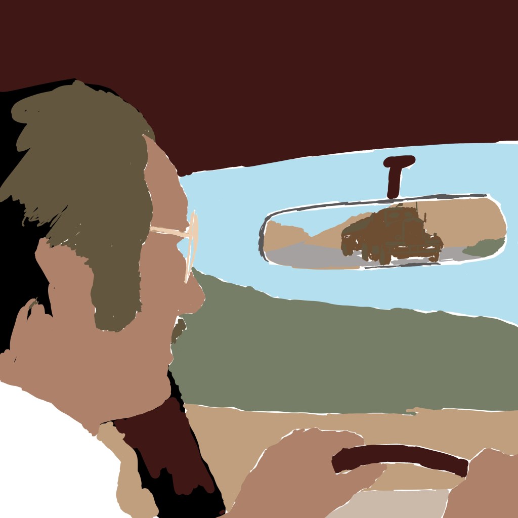 Then, again, to save time, I blocked in the colours extremely flat. I limited to around 6 colours in total, I think – all were droppered from the reference picture itself and then tweaked a little, to ensure that despite the cartoony render, it would be grounded in realistic colour tones. One flat tone for the sandy landscape, one for David’s main skin tone, one for the grass, a dark maroon for the car interior, and a specific tone for the truck. I think also the dashboard is a slightly different beige. Can’t remember. You can see below, without the ink work: