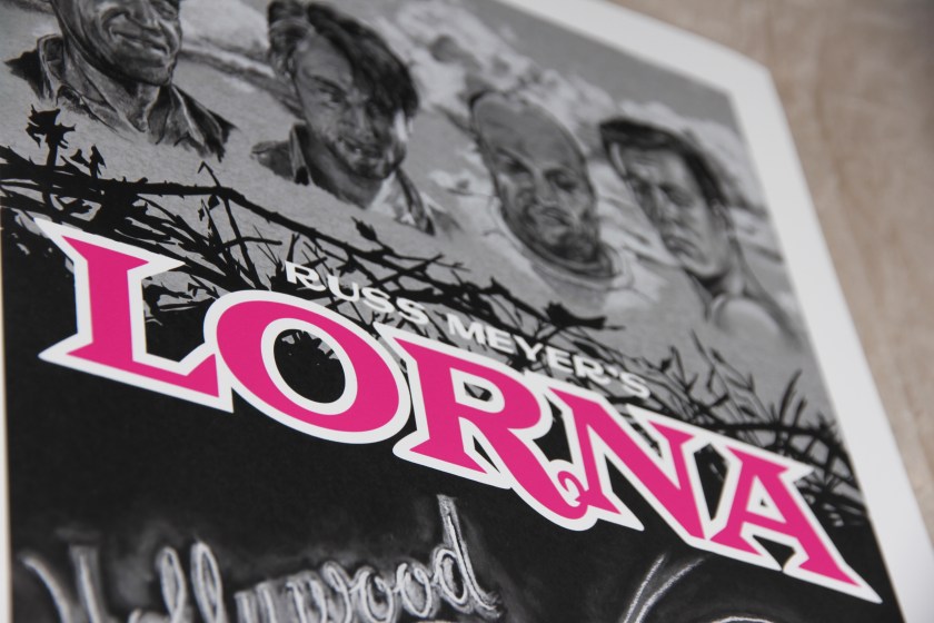 The main image of the poster portrays Lorna lost in a reverie for a life of go-go neon excess and excitement that she so desperately craves, a phenomenal, overwhelming montage of champagne and pearls. Leering from above her, against a foreboding background of the stark and thorny swamp that is her dreary daily reality, are the three lascivious degenerates that desire her, alongside her sadsack spouse.