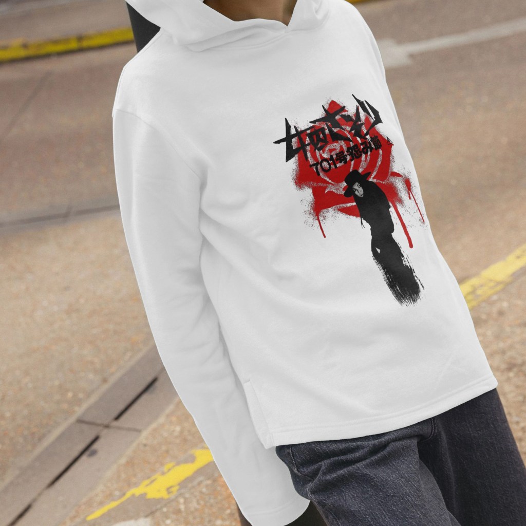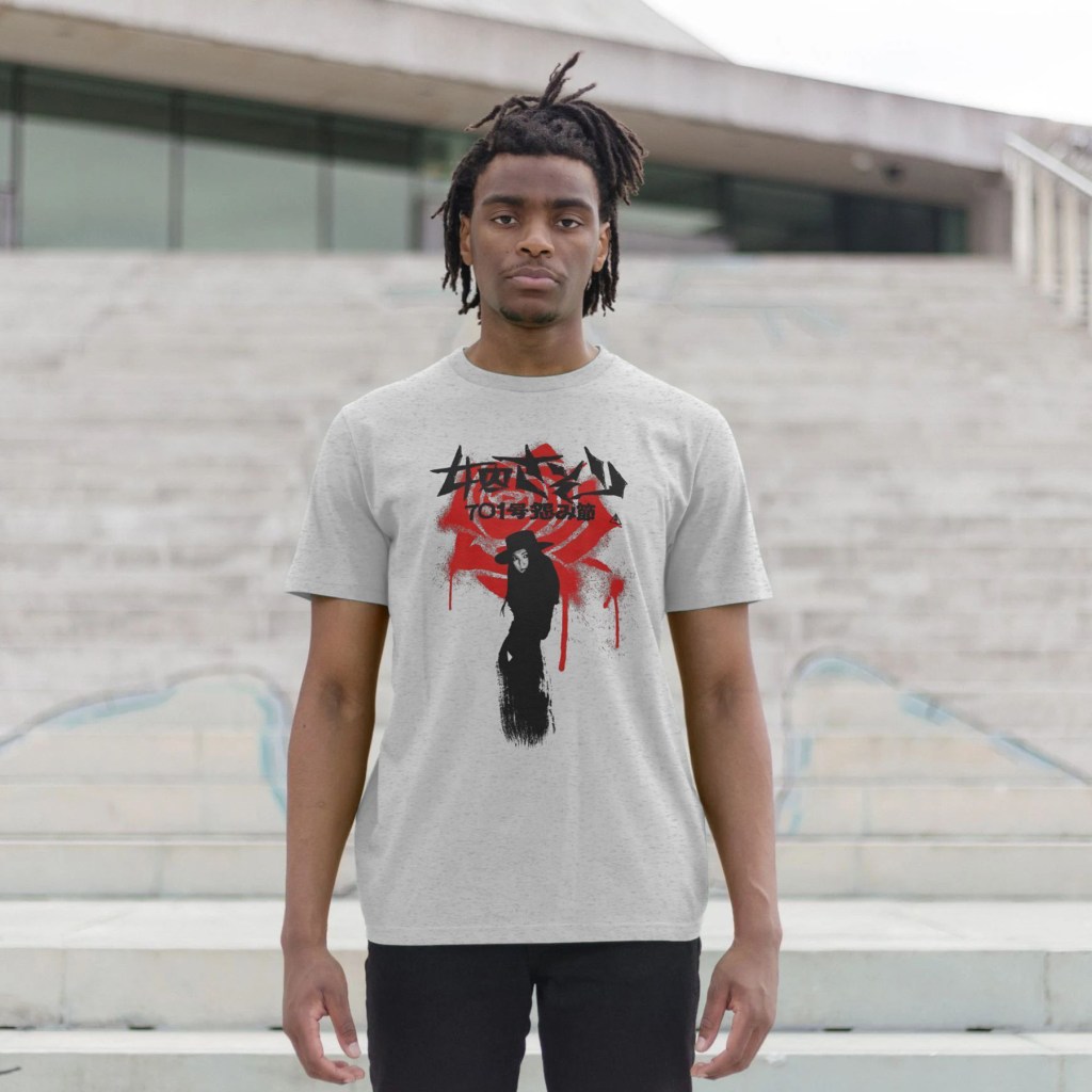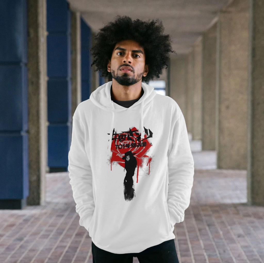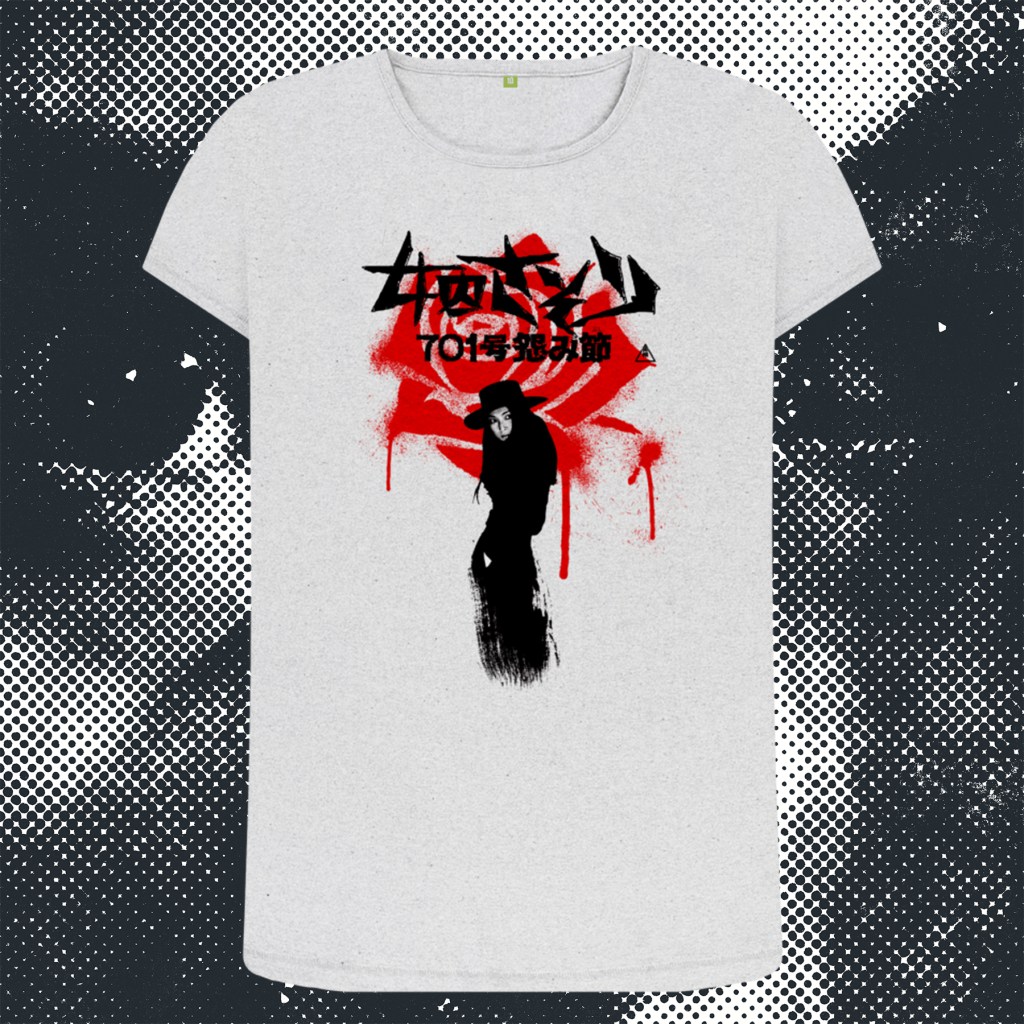 I’ve tried to capture that pared-back simplicity with a bold and stark design that incorporates a flower-shaped bloodstain – visually representing one of the more memorable kills in the series as Nami eludes capture by driving a flower into a cop’s jugular. The bloodstained fabric refers to that visual callback during Nami’s brief moment of physical intimacy she shares with the damaged anarchist she comes to trust enough to take to bed – a visual motif that in the original film also recalls the hinomaru flag.