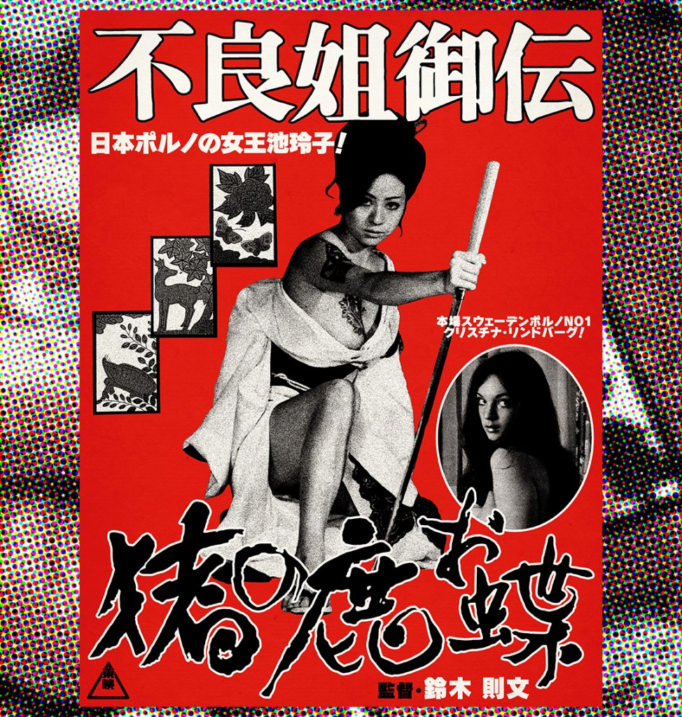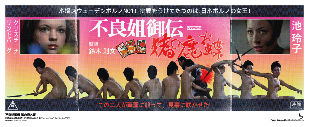 Here are my two designs inspired by the magnificent 不良姐御伝 猪の鹿お蝶 (Furyō anego den: Inoshika o-Chō) a.k.a SEX AND FURY! A large format full-colour poster print, available at Etsy as a gallery grade, 36cm x 87cm giclee print: