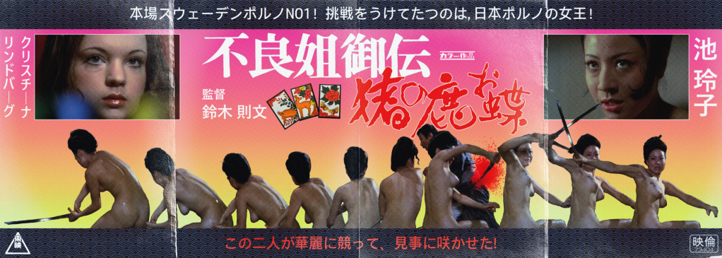 Basic elements in place, I started adding text. Again, I think the mixture of vertical and horizontal text would actually be highly unusual in a poster of this era. Ike’s name goes first, as vertical text is read right-to-left rather than left-to-right, although this change was made very last minute after I hired a translator from Fiverr to translate the tagline to the film. It, in the very blunt manner you’d expect, refers to ‘Sweden’s No.1 Porno Queen!’, Lindberg, and that ‘Japan’s Porn Queen Reiko Ike!’ answers her challenge. This, then, dictated the order of the main images. The rest of the tagline, which says something like ‘These two will fight elegantly, and gracefully make the flower bloom!’, was added to the lower part of the poster, in red to help with the colour balance.